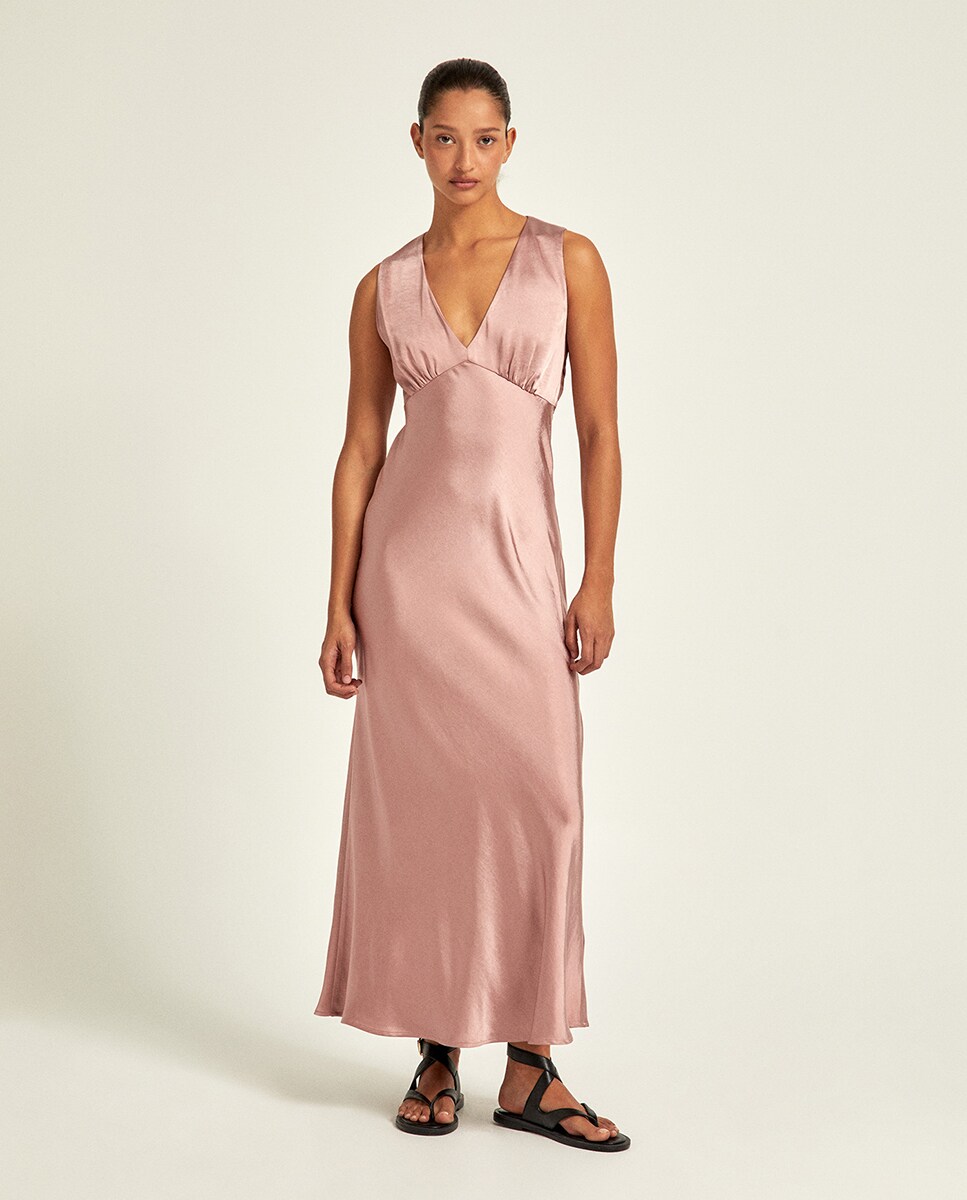 • Vestido de fiesta en satén con escote pico y espalda abierta con lazada