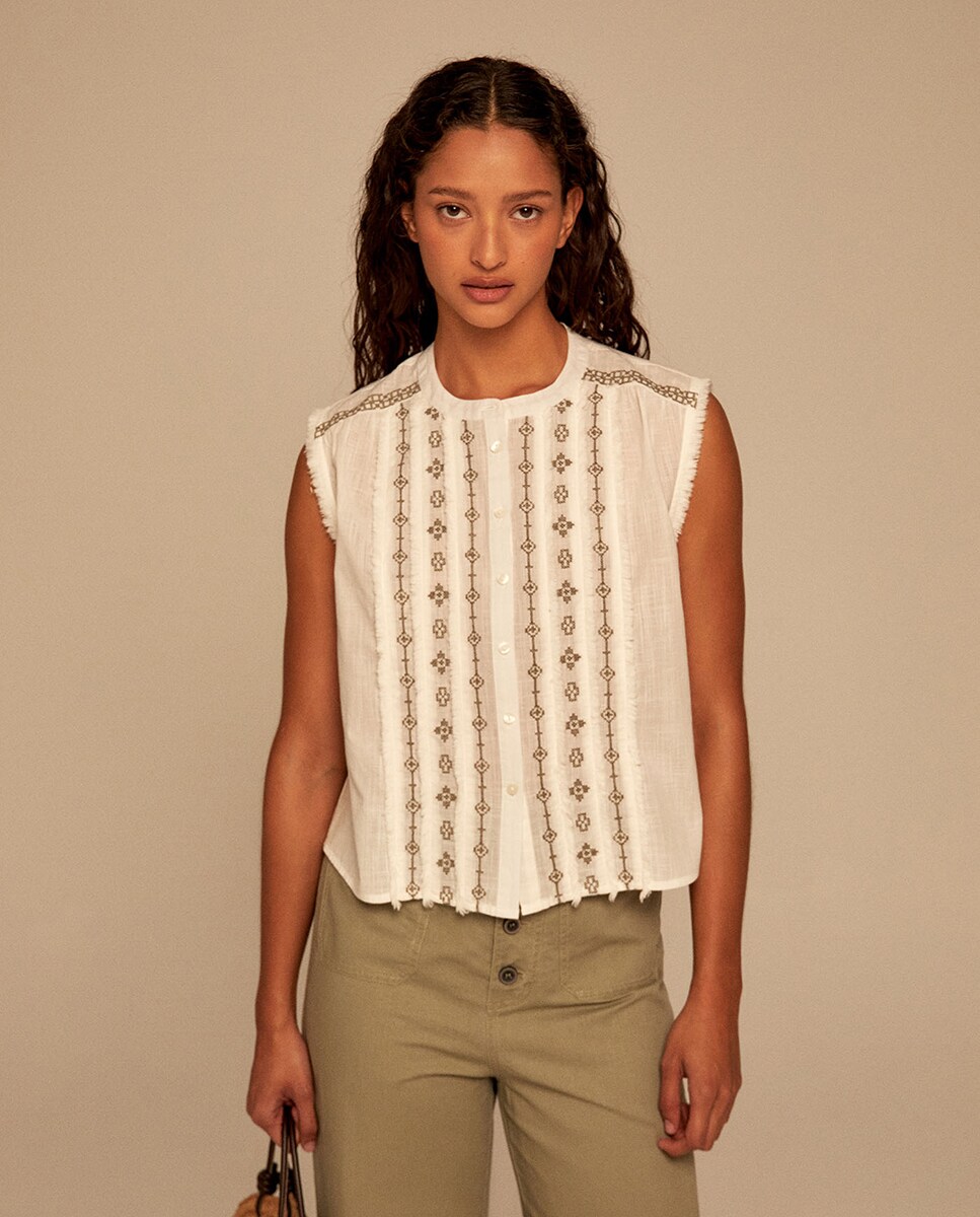 • Blusa bordada con cuello redondo y manga sisa con detalle de flecos. Cierre de botones. Algodón 100%