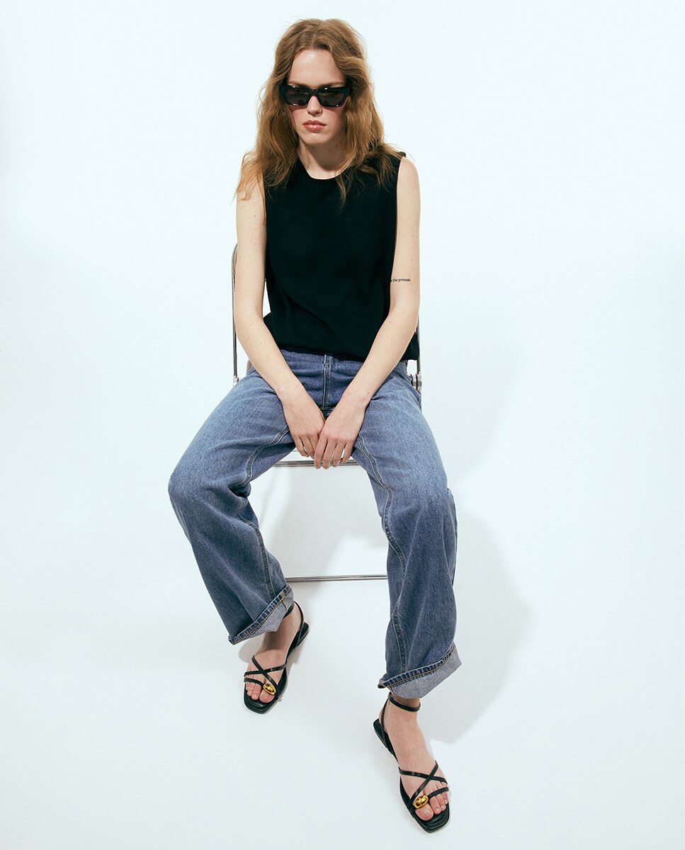 • Sandalia plana de tiras con pieza metálica en dedo. Cierre de hebilla