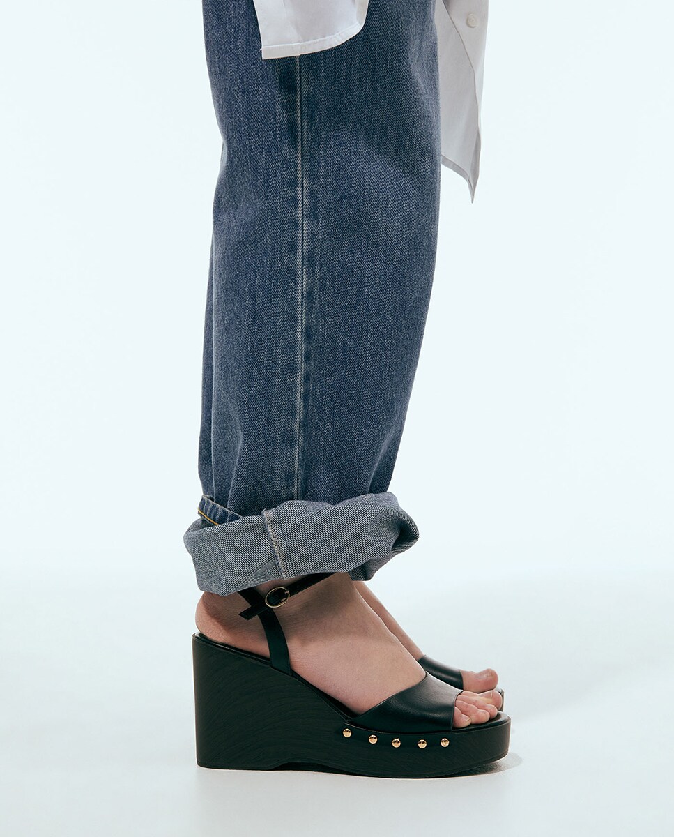 • Cuña con plataforma de madera y detalle de tachas. Cierre de hebilla en tobillo. Plataforma 3,5cm Tacón 10cm