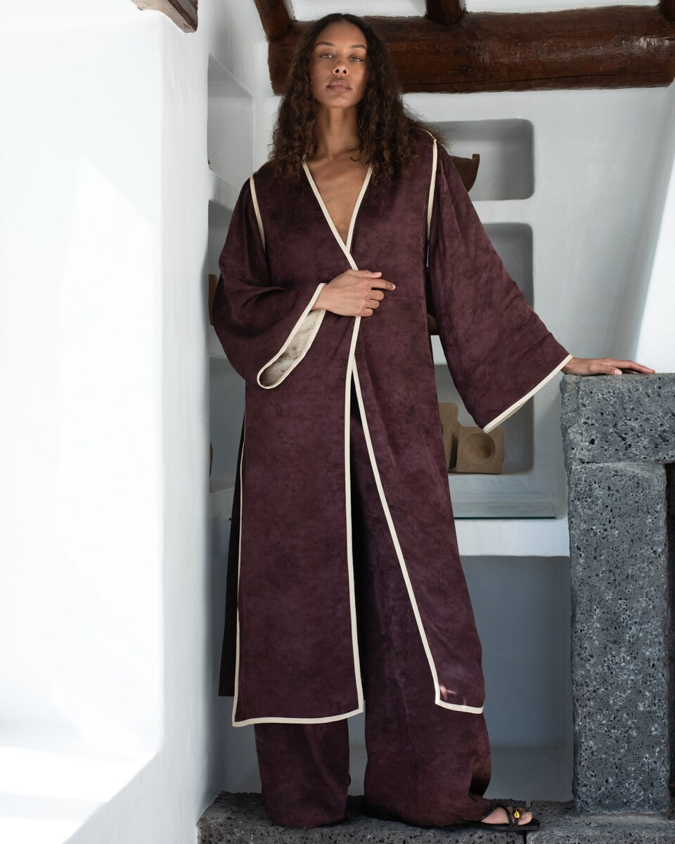 • Kimono jacquard largo con ribete a contraste y cinturón