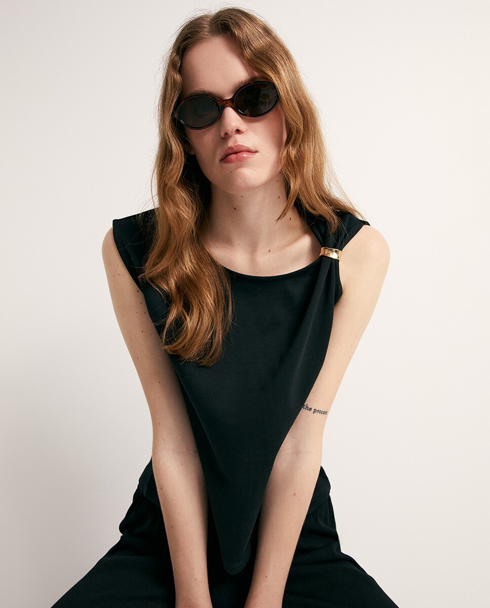 • Top de manga corta con pieza metálica en cuello. Cierre con botón en espalda. Algodón 100%