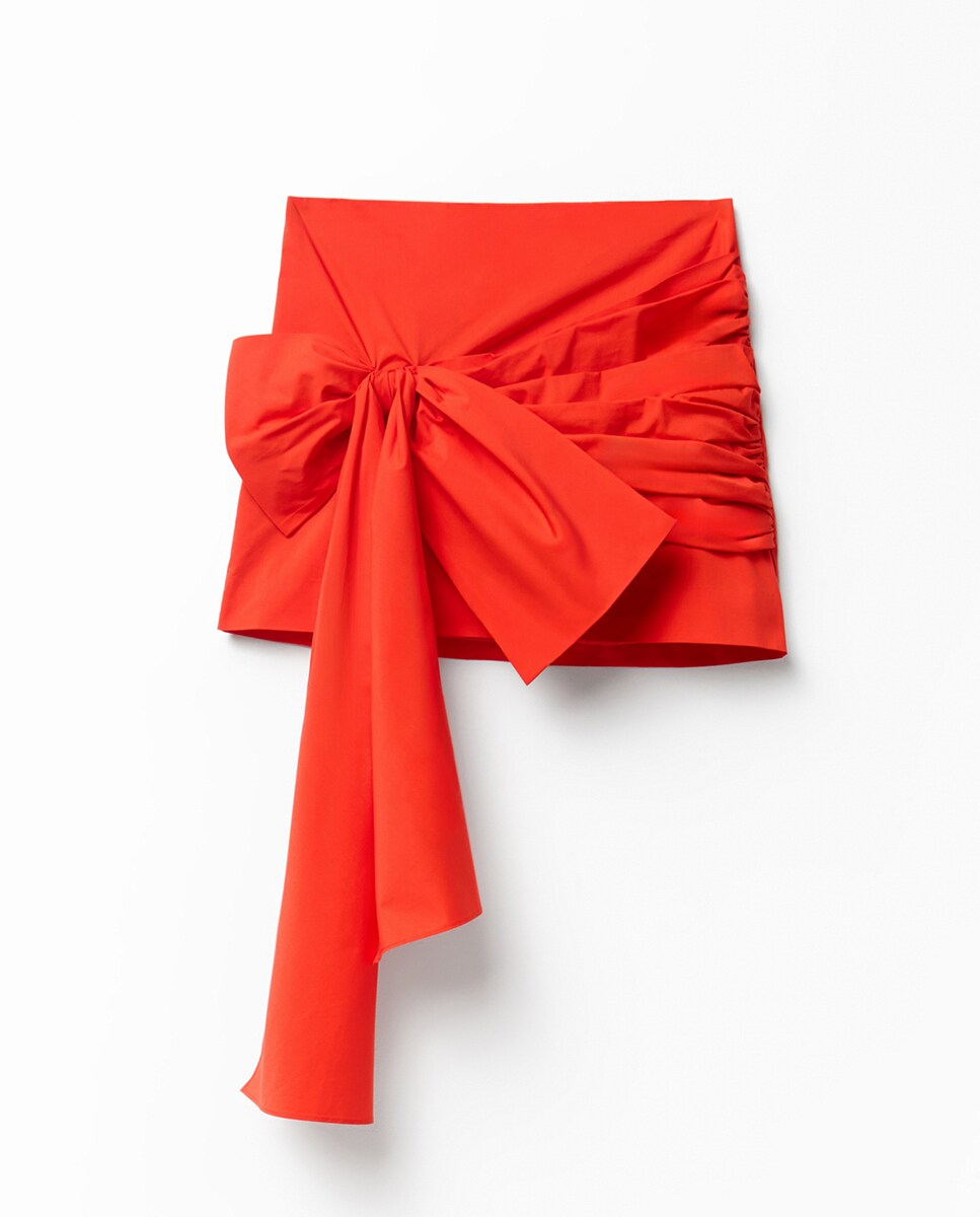 • Falda mini con detalle fruncido y lazo delantero. Cierre trasero de cremallera. Tejido en mezcla de algodón