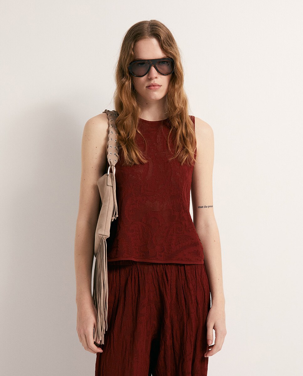 • Top con manga sisa y cuello halter en tejido calado. Cierre de botón con abertura en espalda