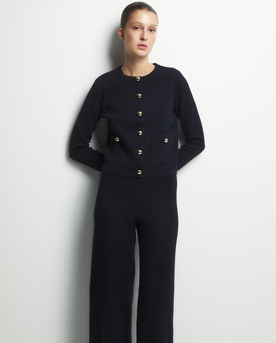 • Chaqueta de punto con manga larga y cuello caja. Detalle delantero de bolsillos y cierre de botones