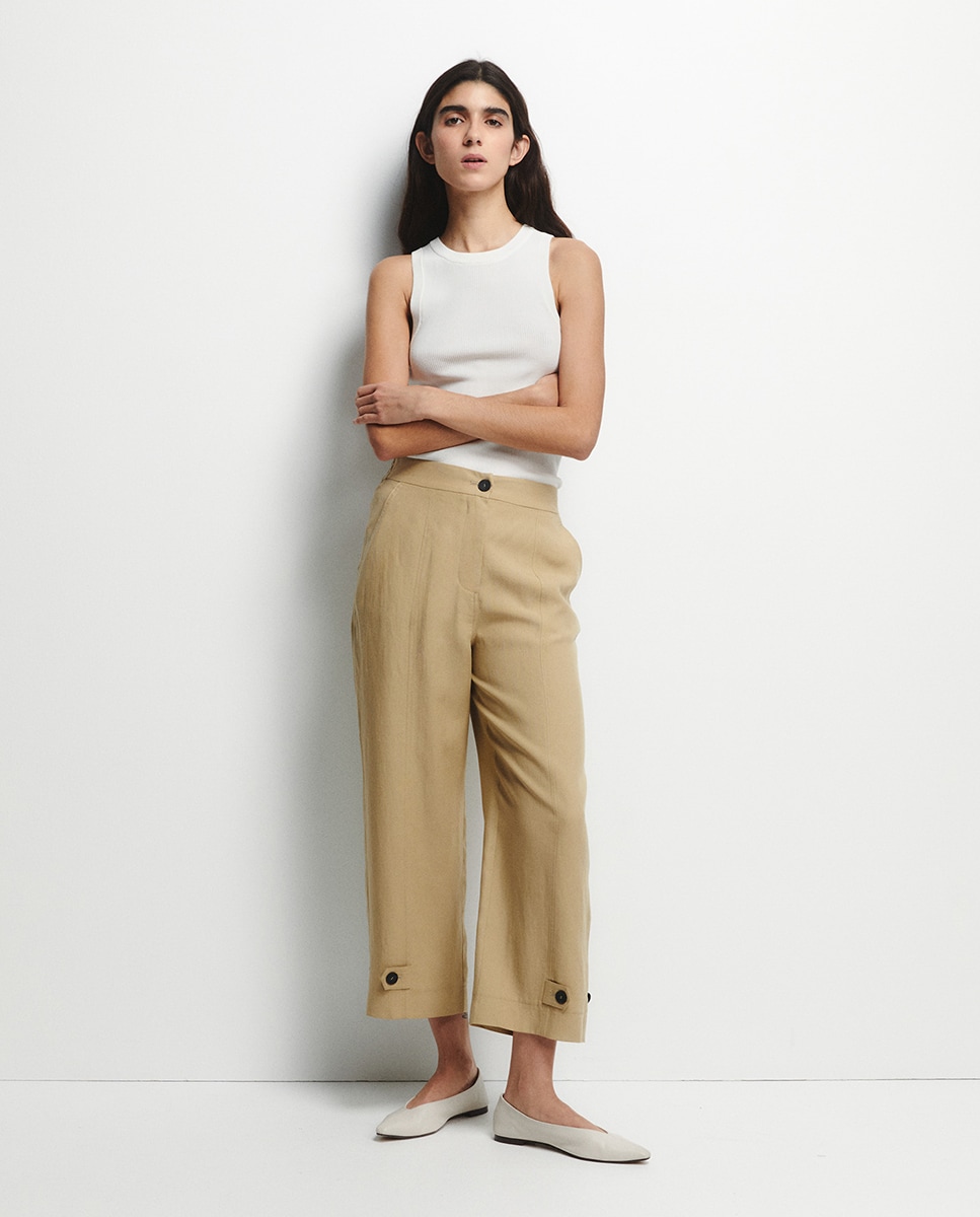 • Pantalón recto fluido con cierre delantero de botón y cremallera. Cinturilla elástica y bolsillos laterales
