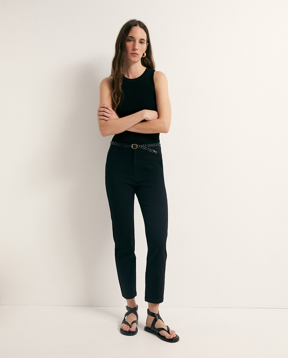 • Pantalón chino recto con cinturón. Bolsillos delanteros. Cierre con botón y cremallera. Tejido en mezcla de algodón