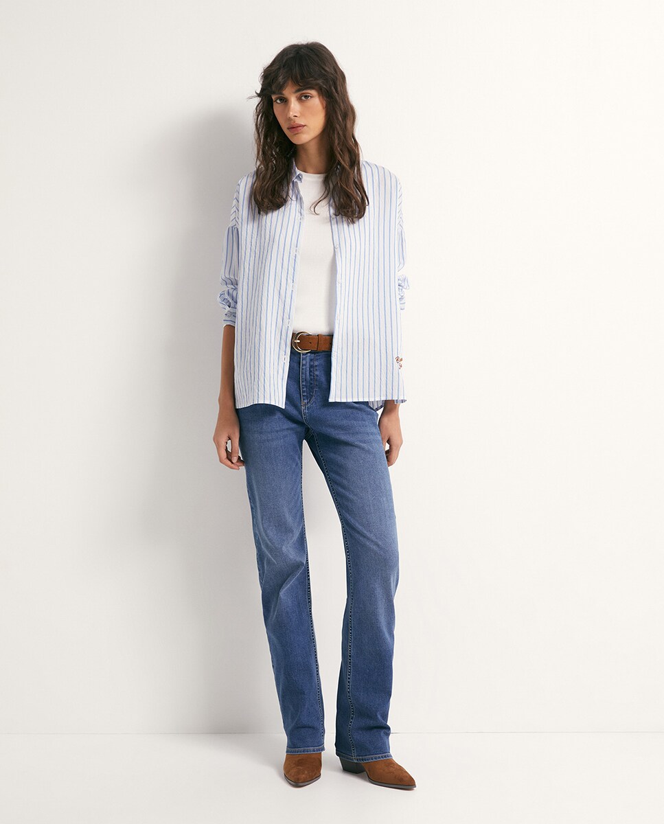 • Jeans de tiro alto y corte recto. Bolsillos y cierre de cremallera oculta y botón