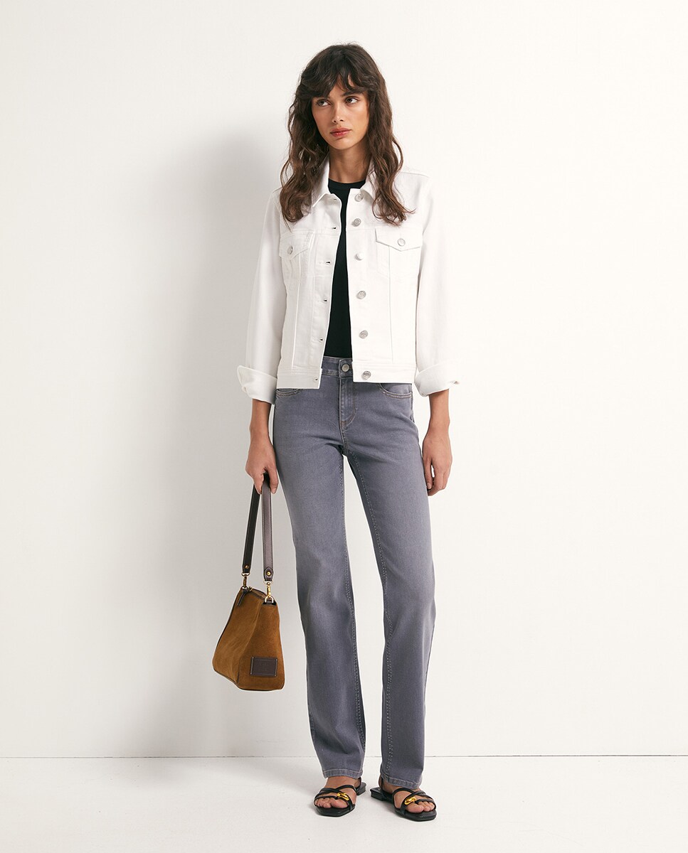 • Pantalón denim de corte recto con bolsillos y cierre de cremallera oculta y botón