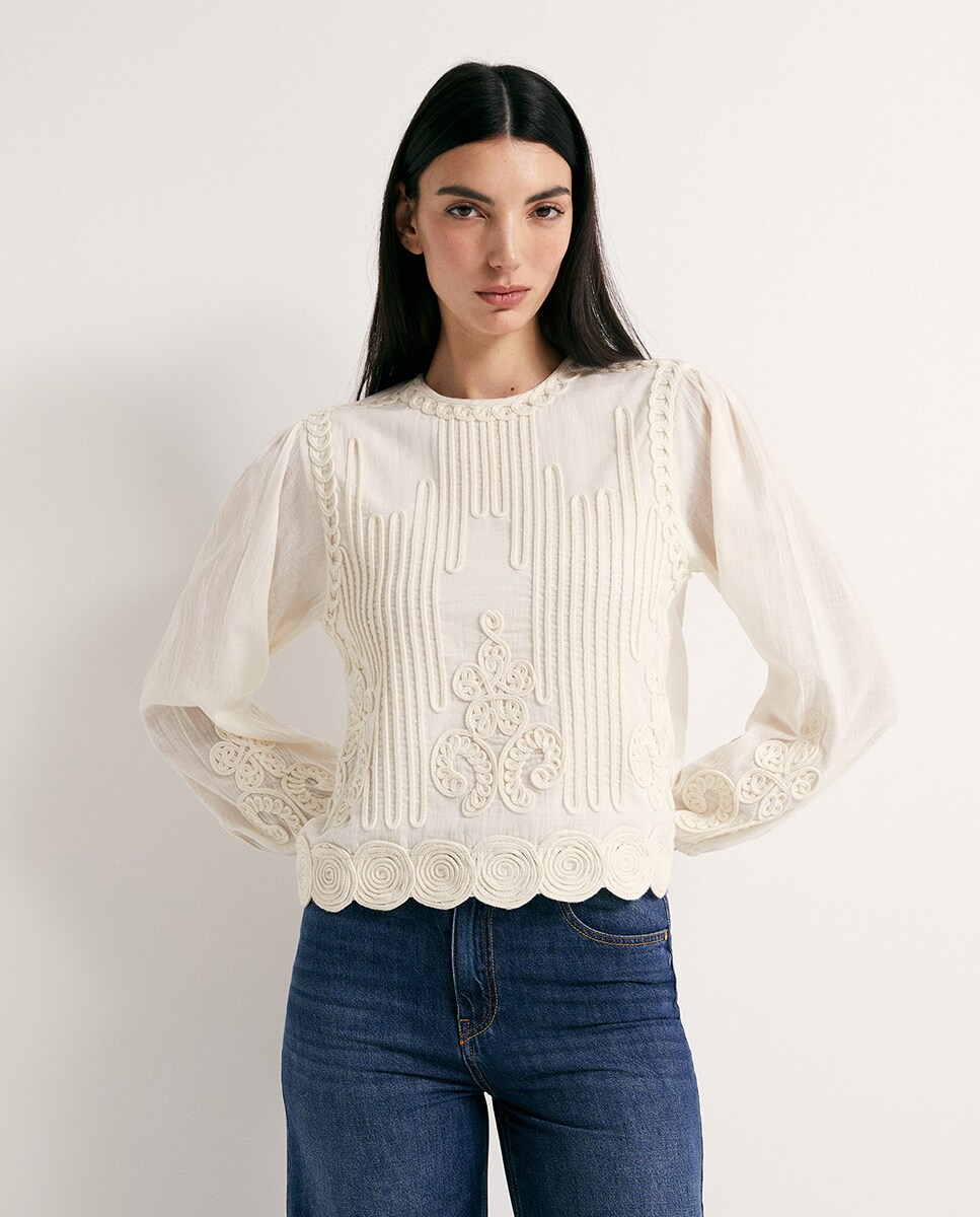 • Camiseta con cuello redondo y manga larga con detalle de cinta. Detalle de abertura en espalda. Algodón 100%