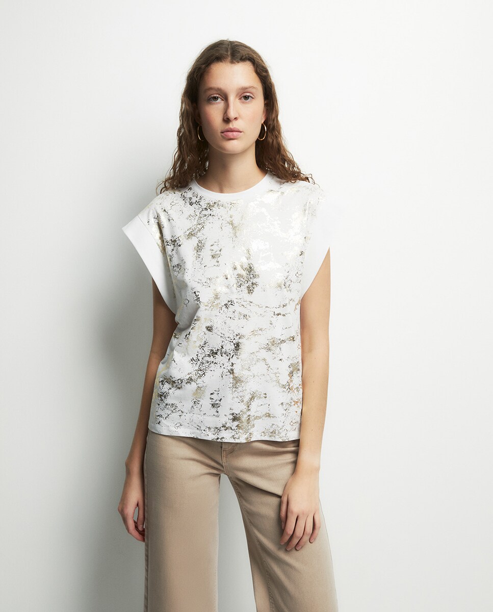 • Camiseta manga sisa y cuello caja con detalle de gráfico frontal. Tejido 100% algodón