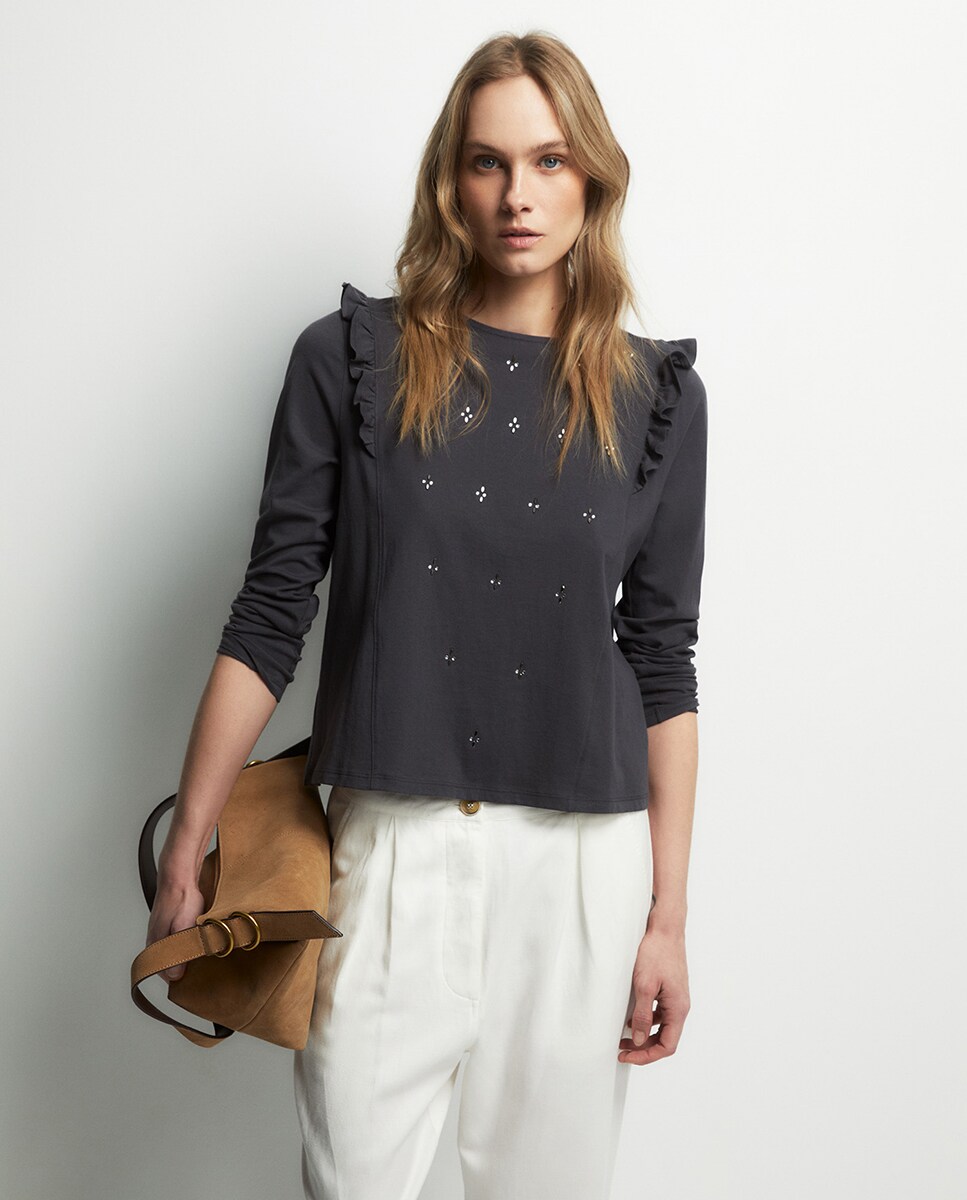 • Camiseta lisa de manga larga con detalle de cristales decorativos y volantes. Algodón 100%