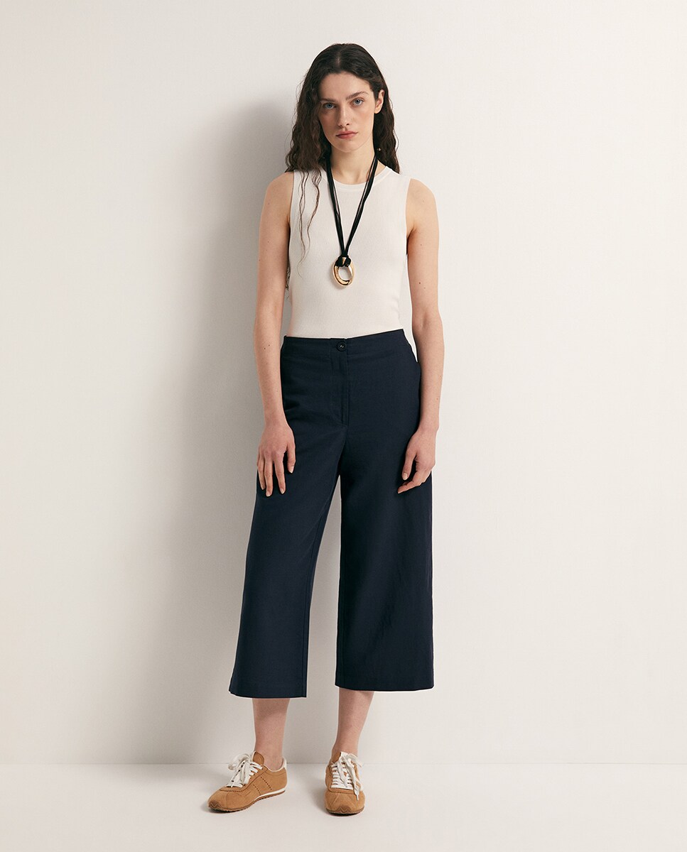 • Pantalón lino culotte con bolsillos laterales y cierre delantero de botón y cremallera. Tejido en mezcla de lino y algodón