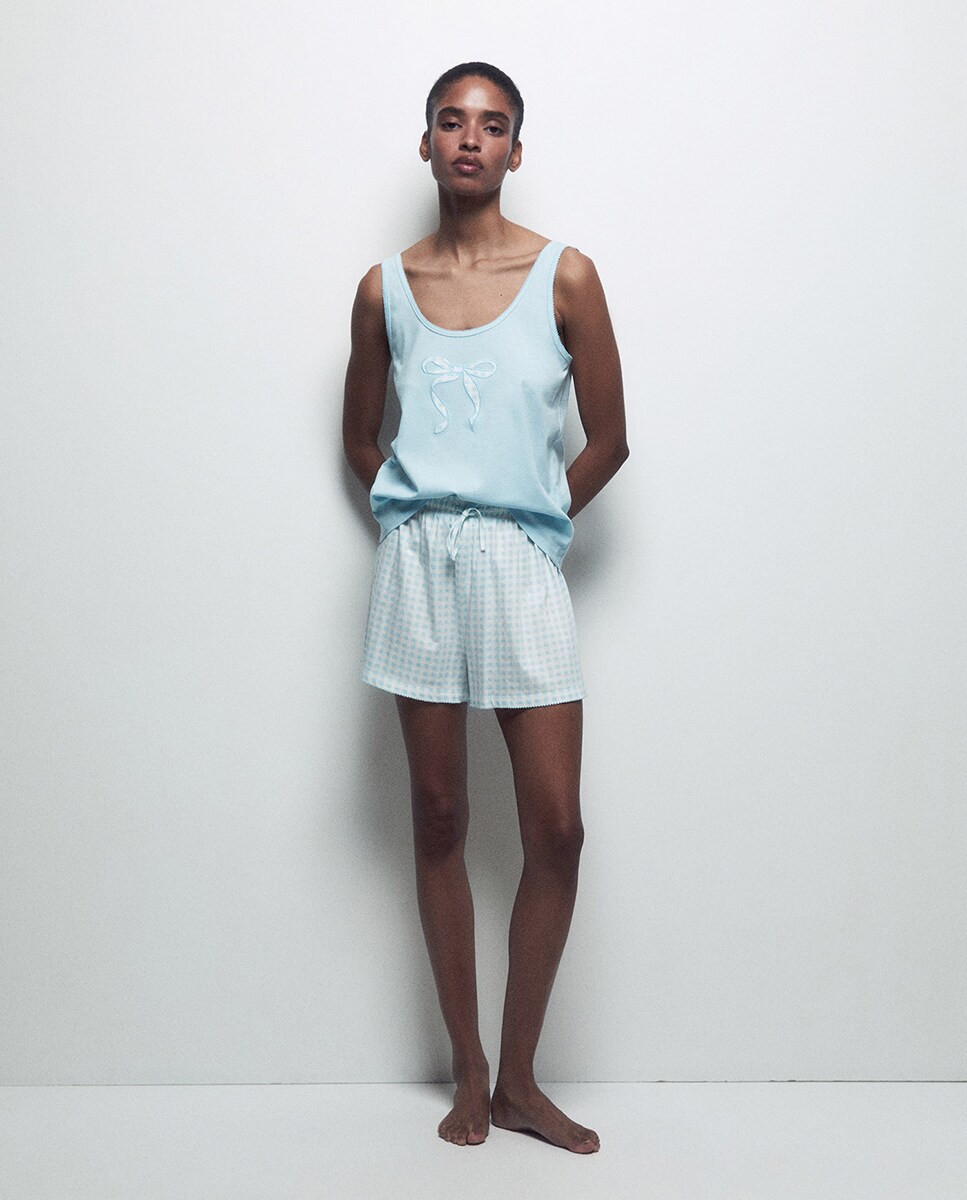 • Pijama corto de tirantes estampado. Pantalón con cinturilla elástica ajustable. Tejido 100% algodón