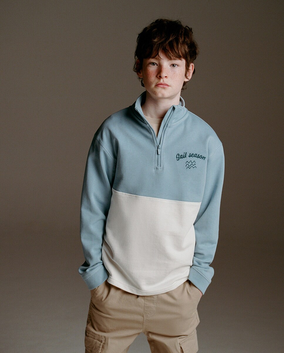 • Sudadera con cuello subido bicolor con detalle de texto. Cierre de cremallera. Algodón 100%