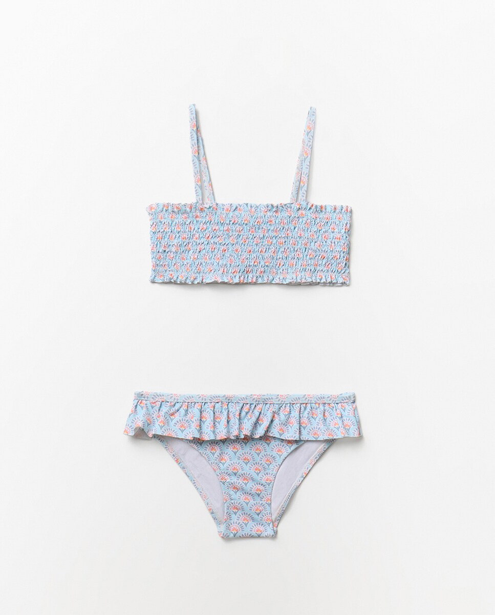 • Bikini dos piezas estampado con top en nido de abeja. Braguita con cinturilla elástica y volante
