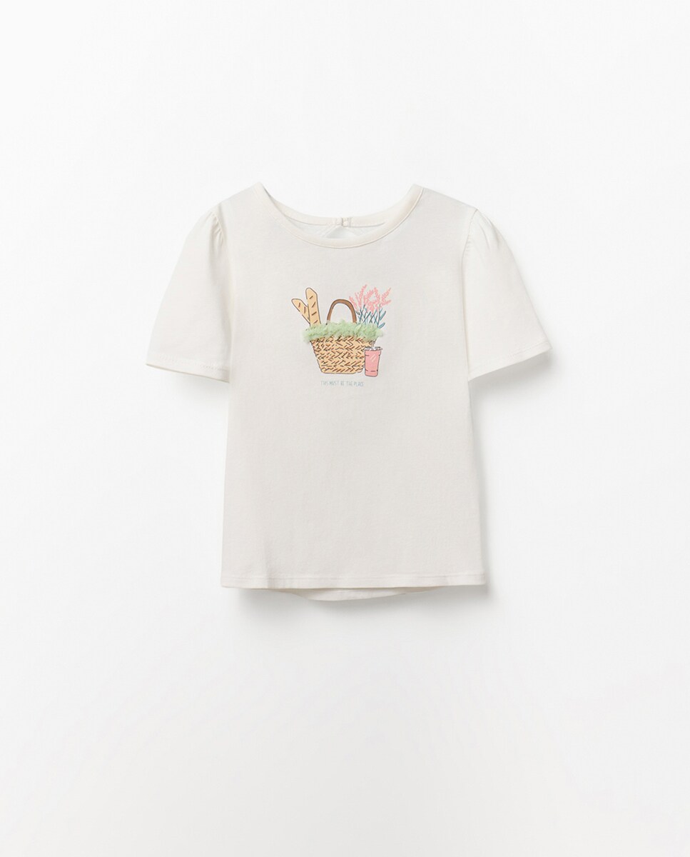 • Camiseta de manga corta con dibujo estampado y detalle de tul. Abertura en la espalda. Algodón 100%