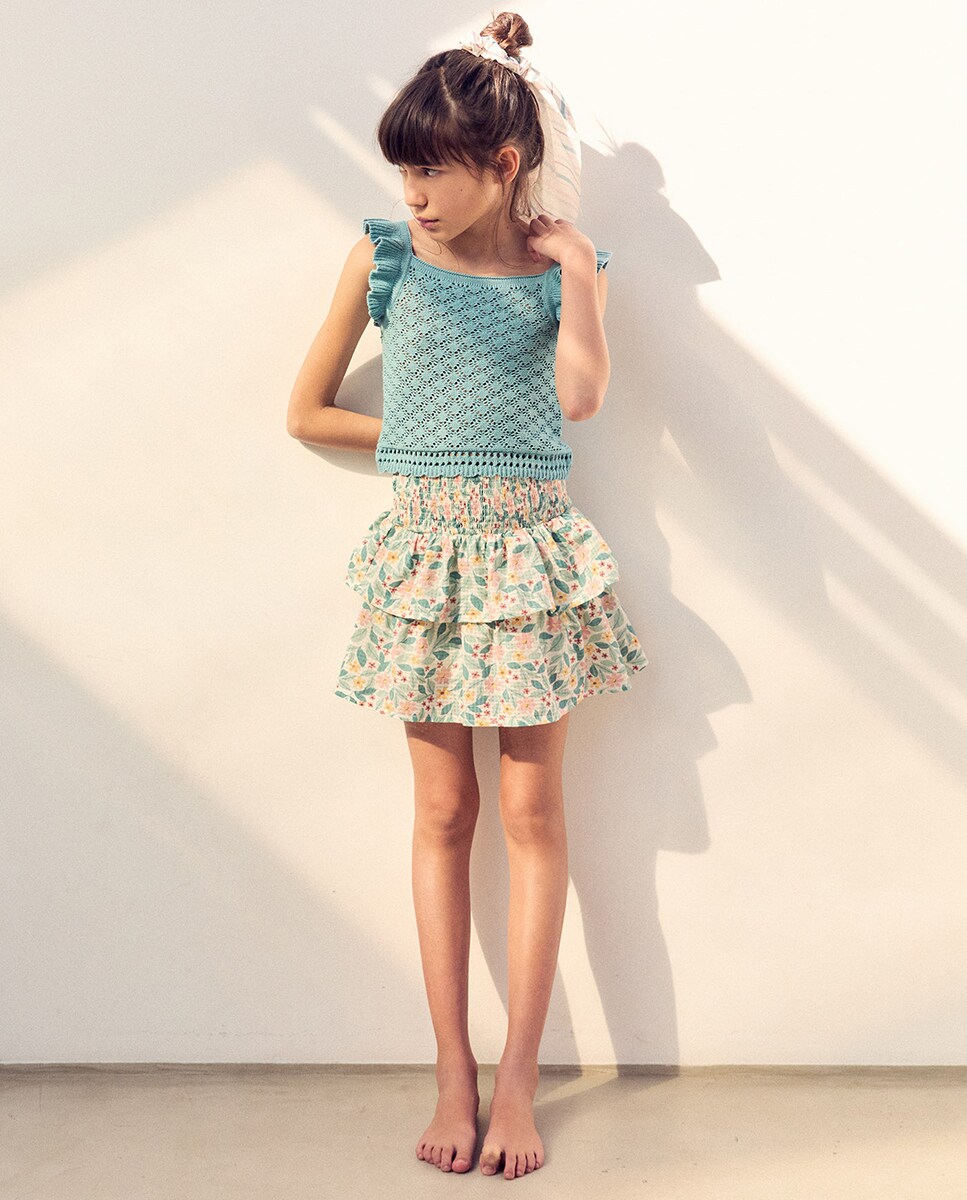 • Falda pantalón estampada con detalle de volantes. Goma en cintura. Algodón 100%