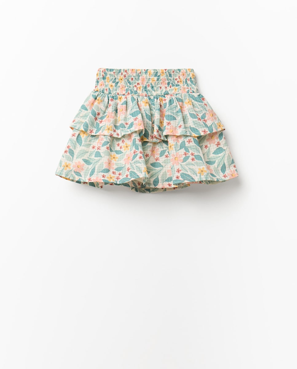 • Falda pantalón estampada con detalle de volantes. Goma en cintura. Algodón 100%
