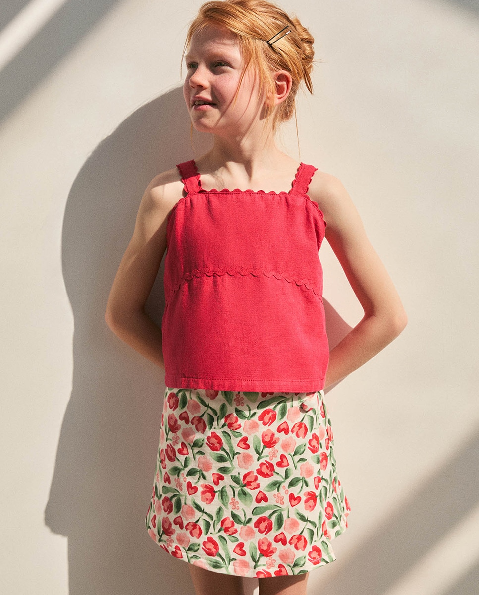 • Falda pantalón estampada con cinturilla elástica. Tejido 100% algodón