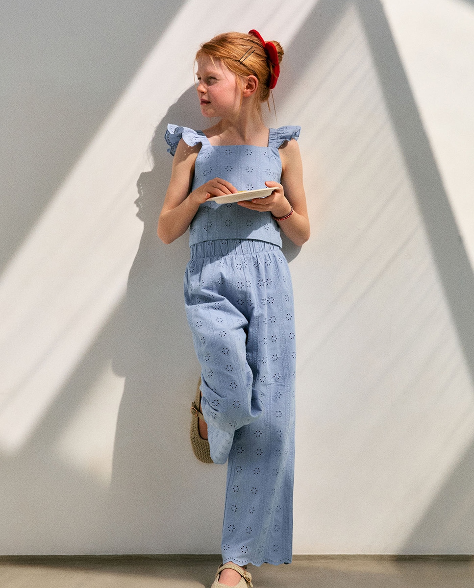 • Pantalón holgado con goma en cinturilla y detalle de flores bordadas. Algodón 100%