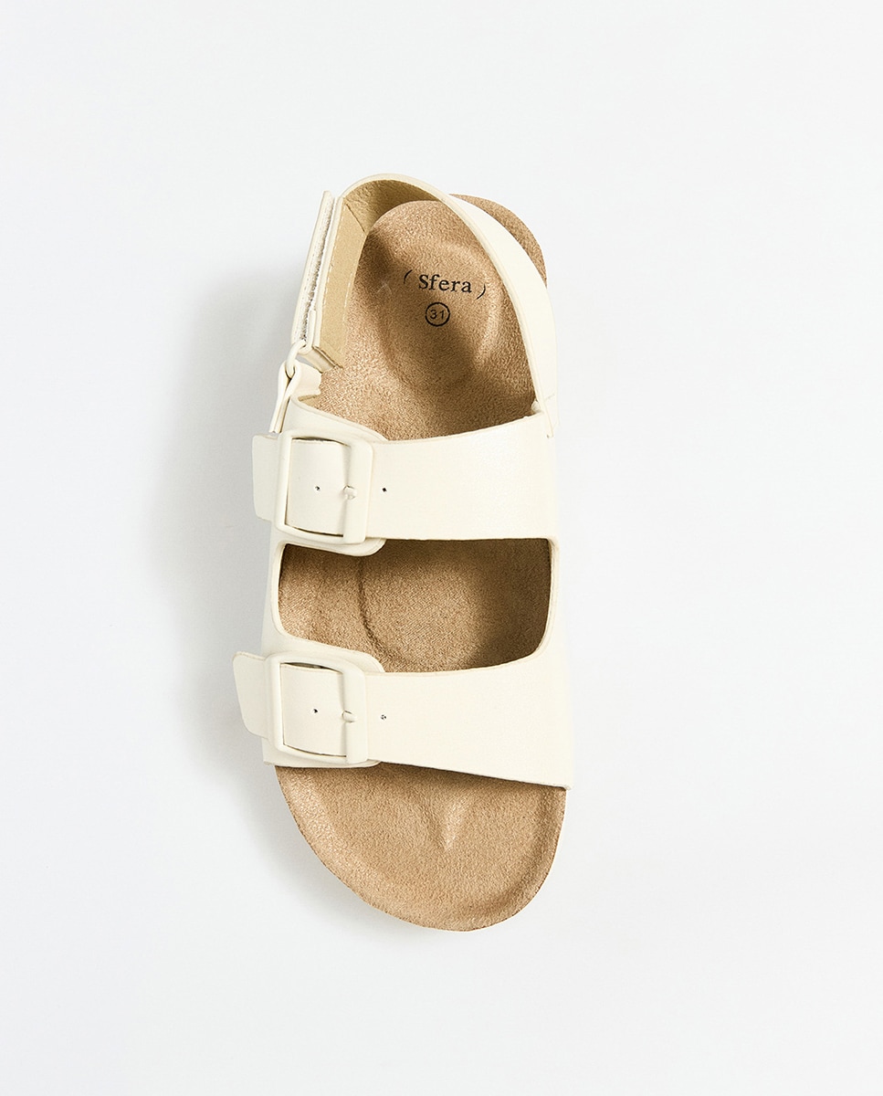 • Sandalia plana bio con hebillas anchas y cierre adherente. Suela de goma