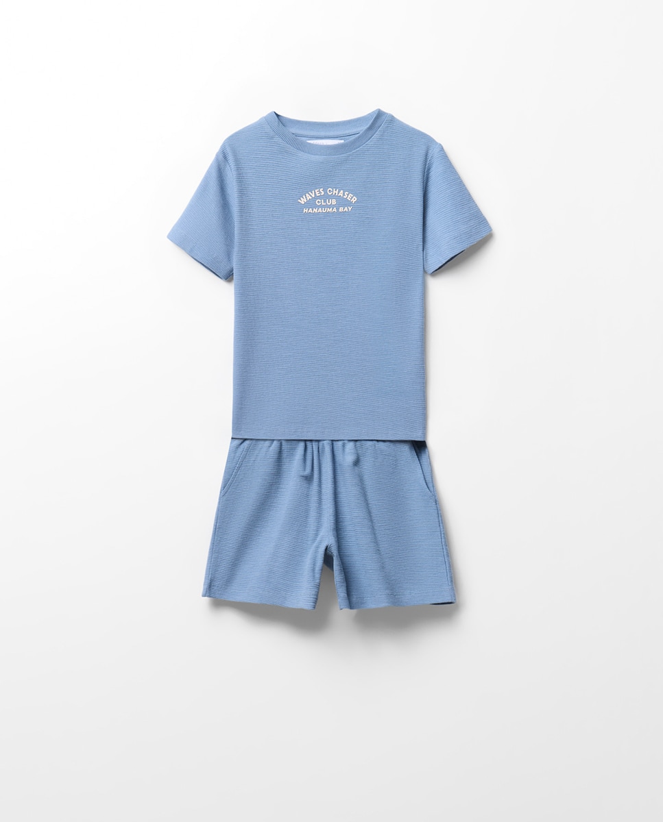 • Conjunto camiseta manga corta y cuello caja con bermuda de cinturilla elástica. Tejido 100% algodón