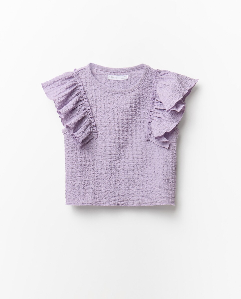 • Camiseta con cuello redondo y manga corta con volante en tejido arrugado