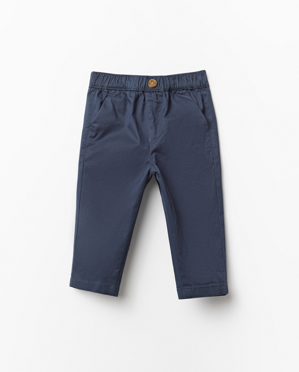 • Pantalón chino con cintura elástica y detalle de botón. Bolsillos laterales y trasero. Tejido 98% de algodón