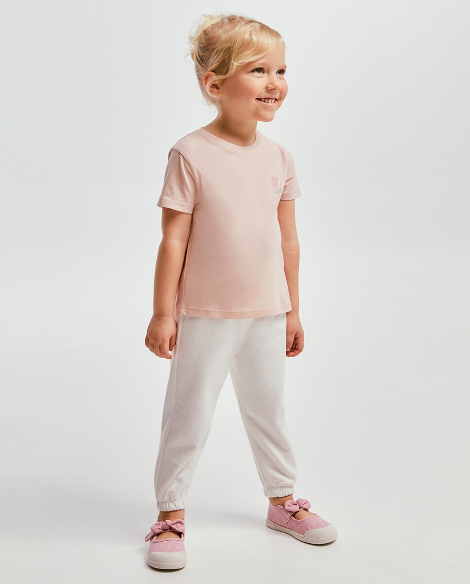 • Pantalón liso con goma en cintura y en bajo. Tejido en mezcla de algodón